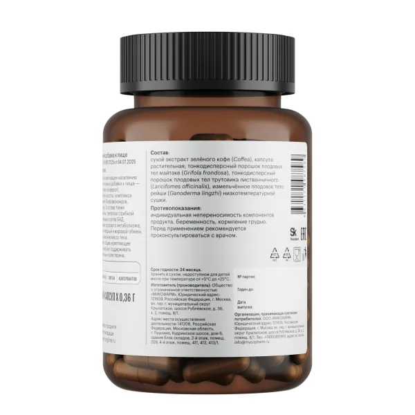 Тонкодисперсный порошок плодовых тел майтаке (Grifola frondosa), трутовика лиственничного (Laricifomes officinalis) и рейши (Ganoderma lingzhi) низкотемпературной сушки; экстракт зелёного кофе (Coffea).